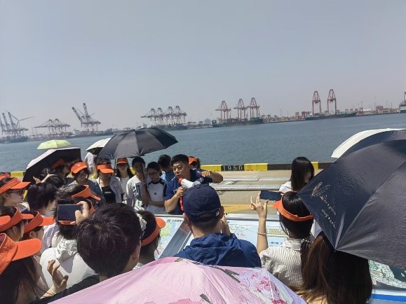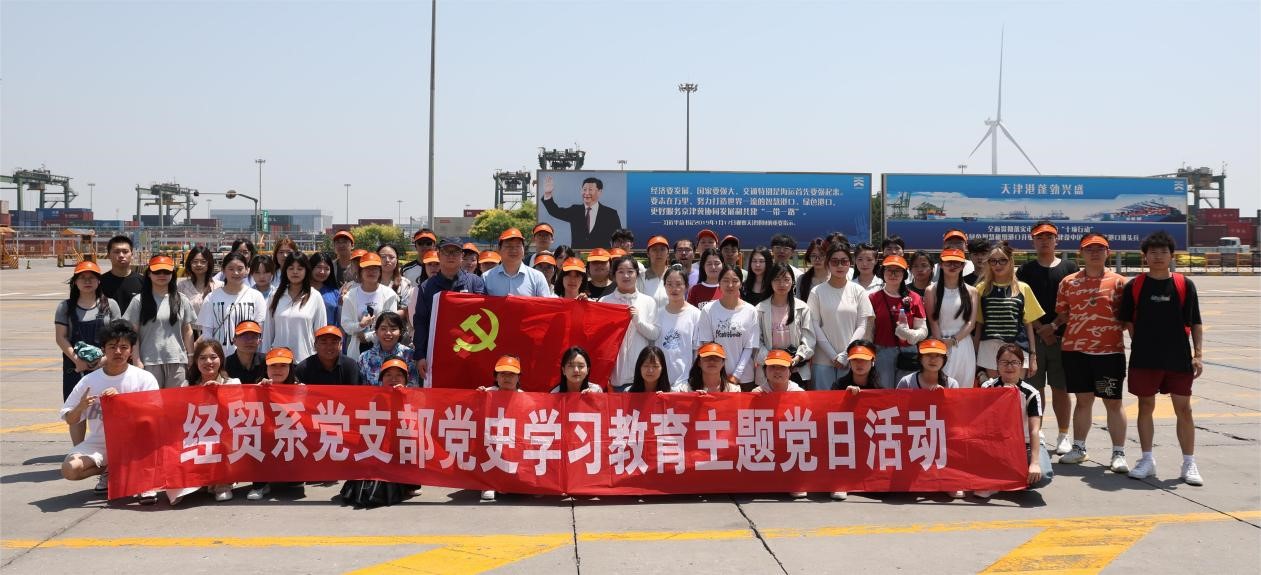 在太平洋码头,同学们来到习近平总书记考察过的码头,聆听了码头工作人员对太平洋码头建设、运营、国际贸易体量与规模的讲解,时不时有同学发起提问,互动交流。经贸系教师党支部和学生党支部还开展了一次特殊的主题党日活动,重温了总书记在天津港考察时的重要讲话精神。