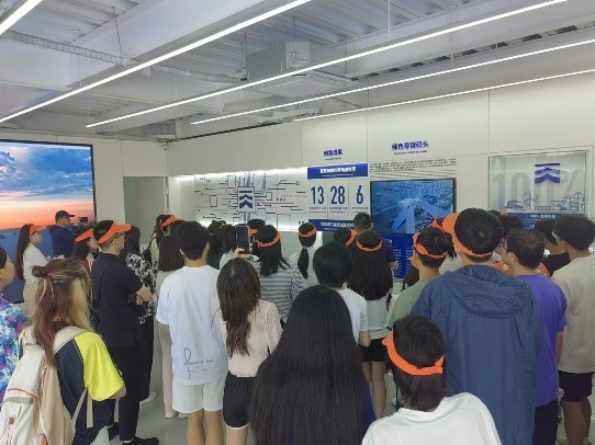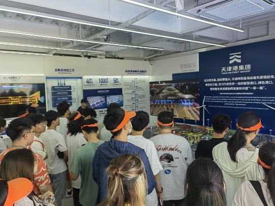 在天津港C段码头,同学们参观了C段码头智慧化展厅,了解了自动化集装箱码头的发展历史、自动化工艺、ART无人自动驾驶(L4级)运输车、智能水平运输系统、5G港口工业专网、绿色零碳码头及创新技术。同学们登上观景台,实地感受了由颜色各异的龙门吊架组成的宏伟壮观的“七彩廊桥”,观摩了自动驾驶货柜装卸车的整个工作流程,了解了20英尺集装箱货柜、冷藏货柜的装箱、代理、报关、发运的全流程。