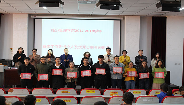 院党委副书记杨振东宣读了《太阳成城集团经济管理学院关于表彰宣传工作先进个人和优秀志愿者的决定》,决定对10名宣传工作先进个人及20名优秀志愿者予以表彰,院领导为获得优秀志愿者及宣传工作先进个人荣誉称号的同学颁发荣誉证书,并合影留念,优秀志愿者和宣传工作先进个人代表分别发表了获奖感言。