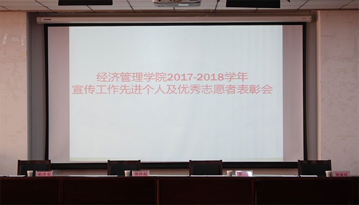 10月16日中午,经济管理学院于明向校区经管楼二层报告厅召开2017-2018学年宣传工作先进个人及优秀志愿者表彰大会。院党委书记李玮、院党委副书记杨振东、副院长陈怀超、学工办主任梁泽莹以及全体辅导员、学生干部和“三创赛”志愿者参加表彰会。大会由梁泽莹主持。