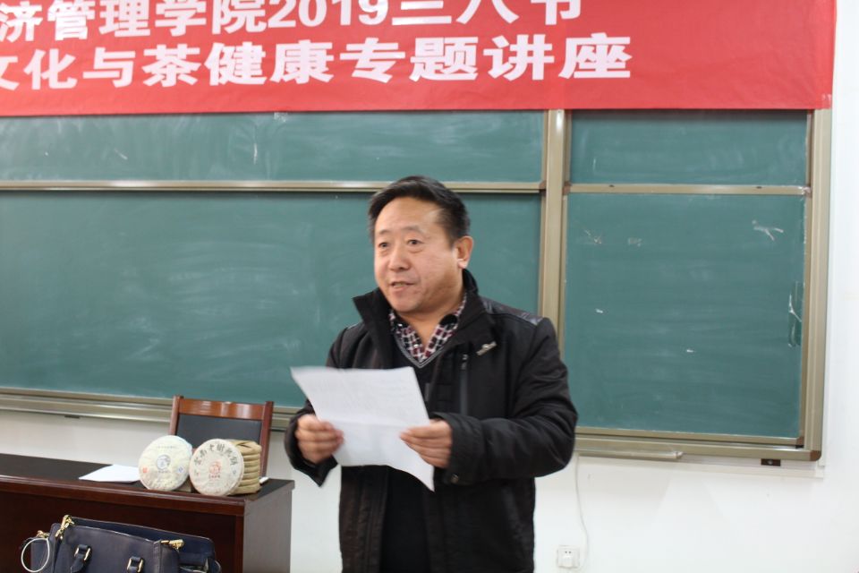 3月6日下午,经济管理学院于我校明向校区经管楼229会议室举办2019三八节茶文化与茶健康专题讲座。经济管理学院院长栗继祖、工会主席李义民、女工委主任梁泽莹出席此次讲座。学院全体女教师参加此次活动。讲座由梁泽莹主持,由中国茶叶流通协会常务理事张晓鸿主讲,泰香阁茶艺师张玉婷现场演示茶艺。