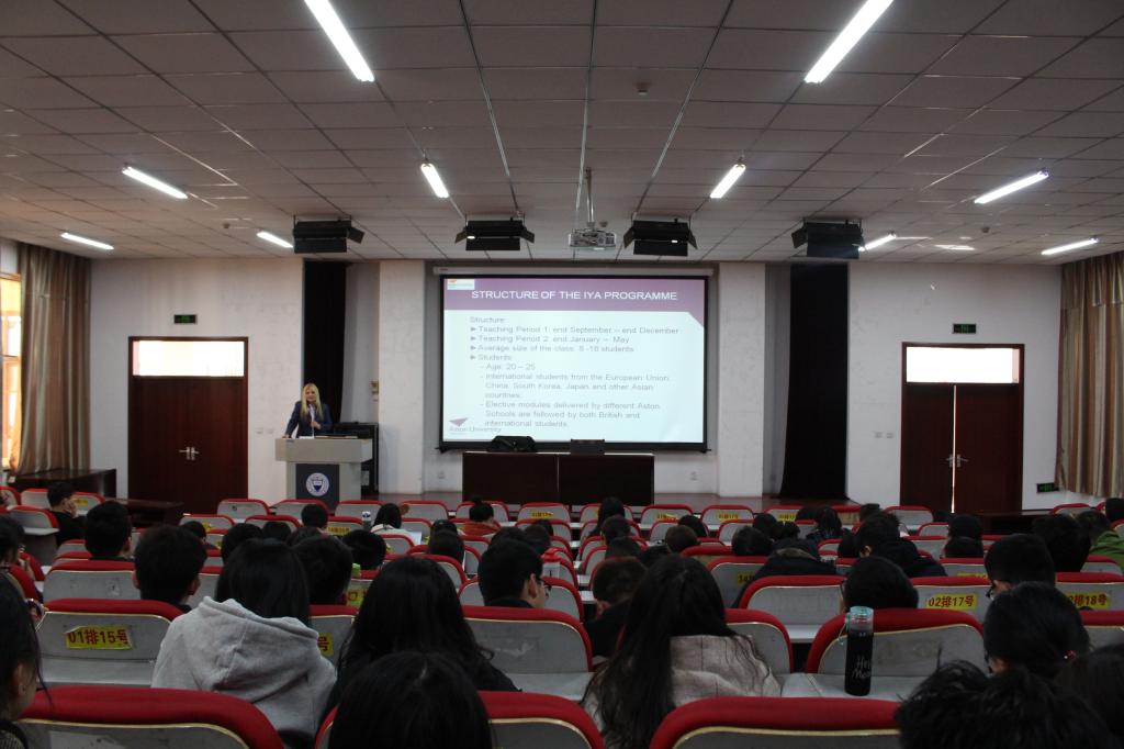 随后,主讲人、阿斯顿大学负责国际合作事务的Dr.Branka Visnjic对IYA这一长期项目进行了详细介绍。她指出了这一项目的特别之处,强调了IYA项目给学生带来的好处,还介绍了此项目所针对的对象、费用、需求以及申请等方面的内容。此项目的学习分为核心模块、选修模块和社会计划体验式学习三个模块,同时,也会安排不同的授课结构和学业检测考试。另外,还穿插介绍了阿斯顿大学的地理位置、气候条件、周边环境和住宿等相关情况。