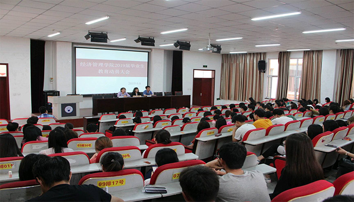 6月6日上午,经济管理学院在学院报告厅召开2019届毕业生教育动员大会,院党委书记李玮、党委副书记杨振东出席大会,2019届全体毕业生按专业划分为三个场次参加大会,大会由院学工办主任梁泽莹主持。
