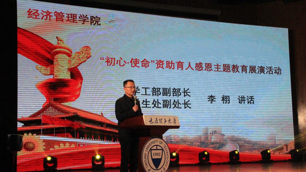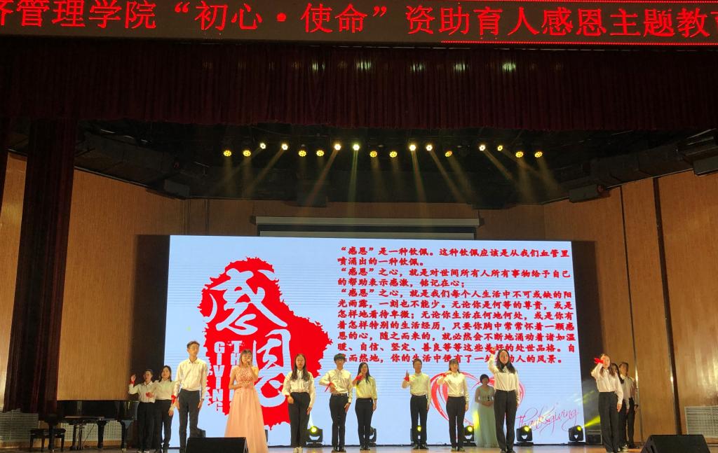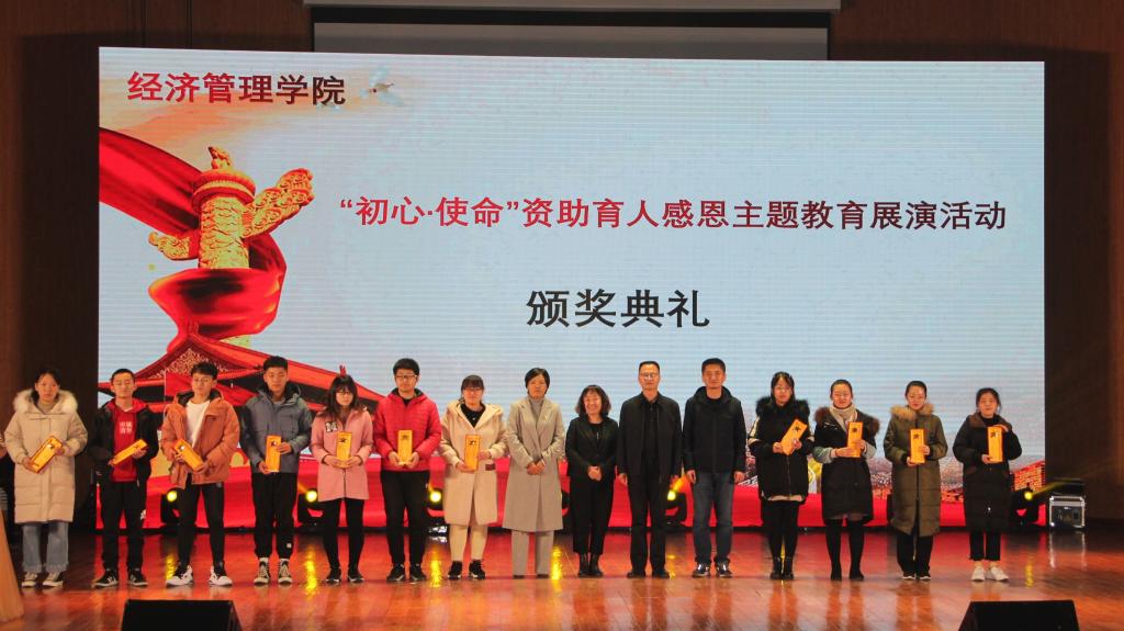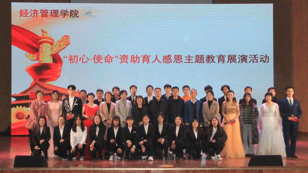 11月26日晚,经济管理学院在明向校区学生活动中心举行“初心·使命”资助育人感恩主题教育展演活动。校学生处副处长李栩、学生处学生资助科科长张晓梅、院党委书记李玮、党委副书记杨振东、副院长陈怀超、学工办主任梁泽莹、团委书记郝晓飞以及全体辅导员老师出席活动。17级、18级全体学生观看了展演。