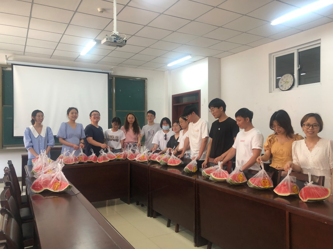 李玮书记现场收集并解决了研究生代表提出的留校期间存在的困难,代表学院给同学们提供了蚊香、藿香正气水以及消毒液等常备用品,并为大家分发了清热解暑的西瓜,将学院对同学们的关怀送到了大家身边。