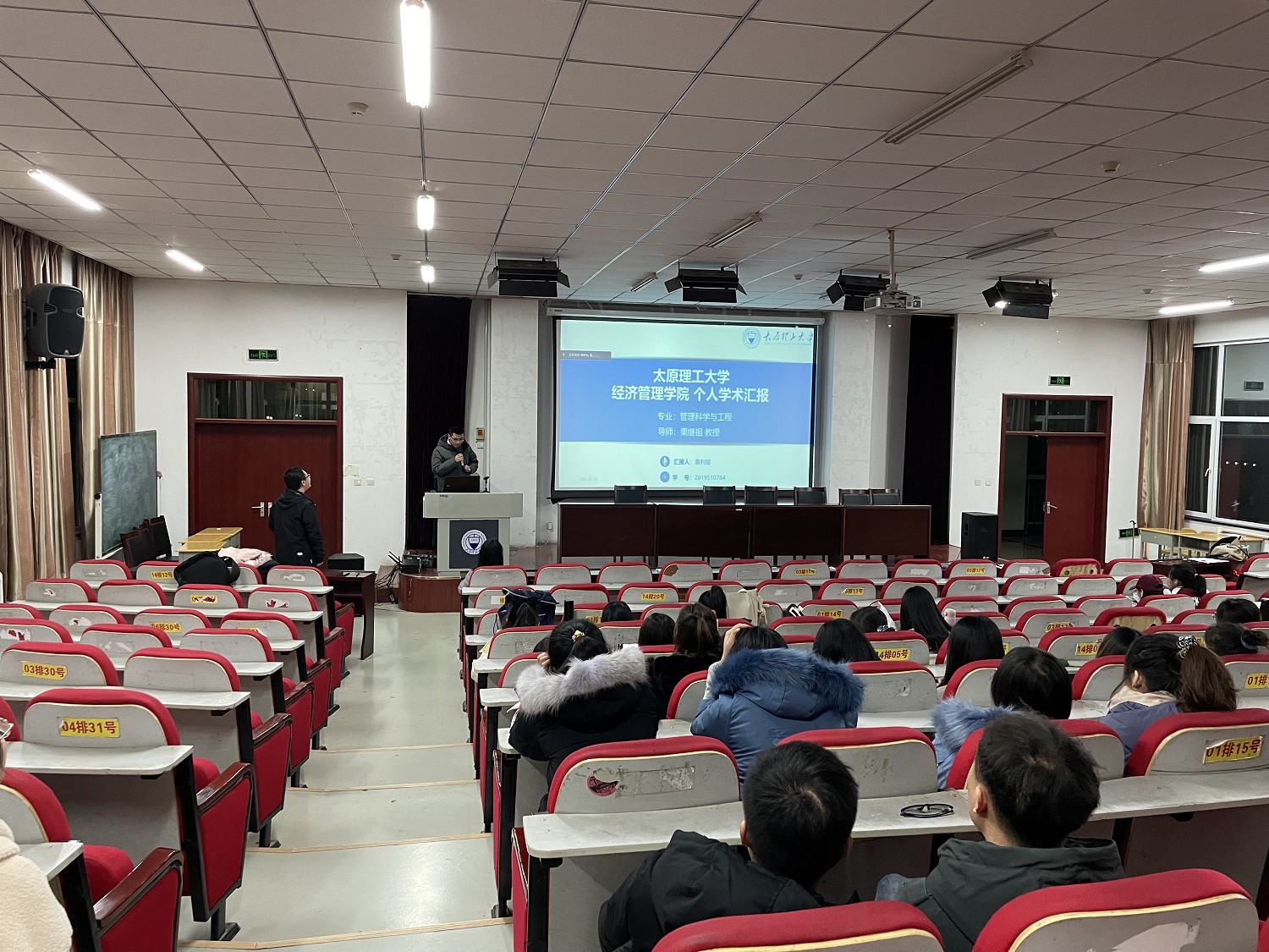 11月19日晚,经济管理学院在学院报告厅举行了研究生国家奖学金获奖事迹宣讲会,两位2021年获得研究生国家奖学金的优秀研究生进行经验分享,全体2020级、2021级硕士研究生和博士生参加了本次报告会。