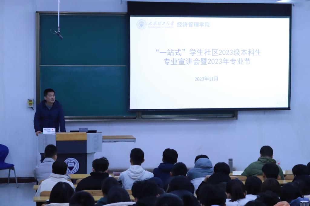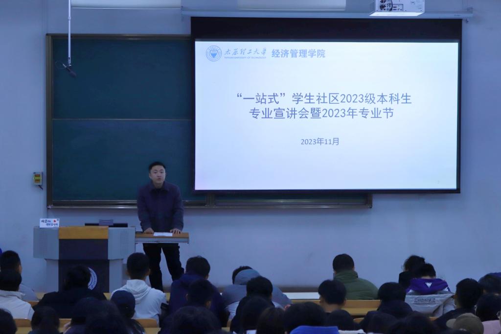 11月10日下午三点,经济管理学院在行知楼C123教室举行“一站式”学生社区2023级本科生“专业之旅”之专业宣讲会。经济管理学院党委副书记杨振东、学工办副主任张志卿、各专业教师、辅导员代表、大四学生代表出席宣讲会,求实学院2023级工程管理、会计学、物流管理、国际经济与贸易专业新生参加本次宣讲会。