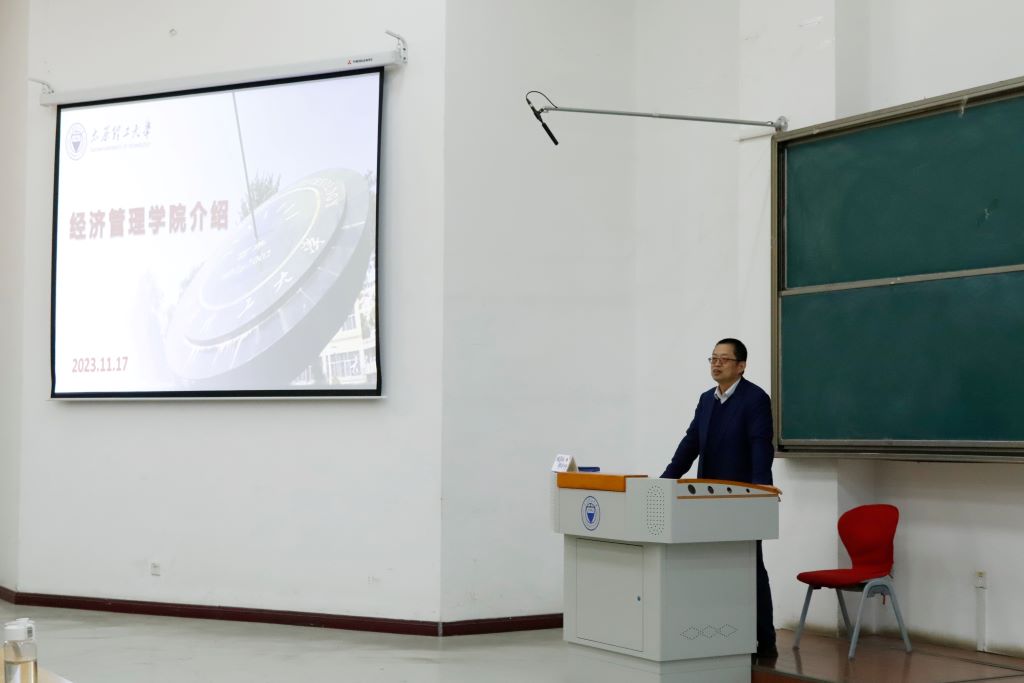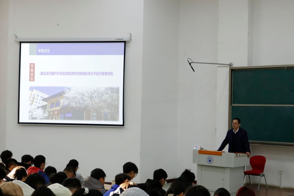 栗继祖围绕学院机构设置与师资队伍、学科与专业介绍、平台与基地建设、相关科研成果、学生学习与活动等几个方面向同学们阐述了“建设成为国内外知名的能源特色鲜明的高水平经济管理学院”的学院定位。鼓励同学们珍惜时光、积极投身科研事业,未雨绸缪、合理规划大学生活,奋发图强、早日实现自身价值。