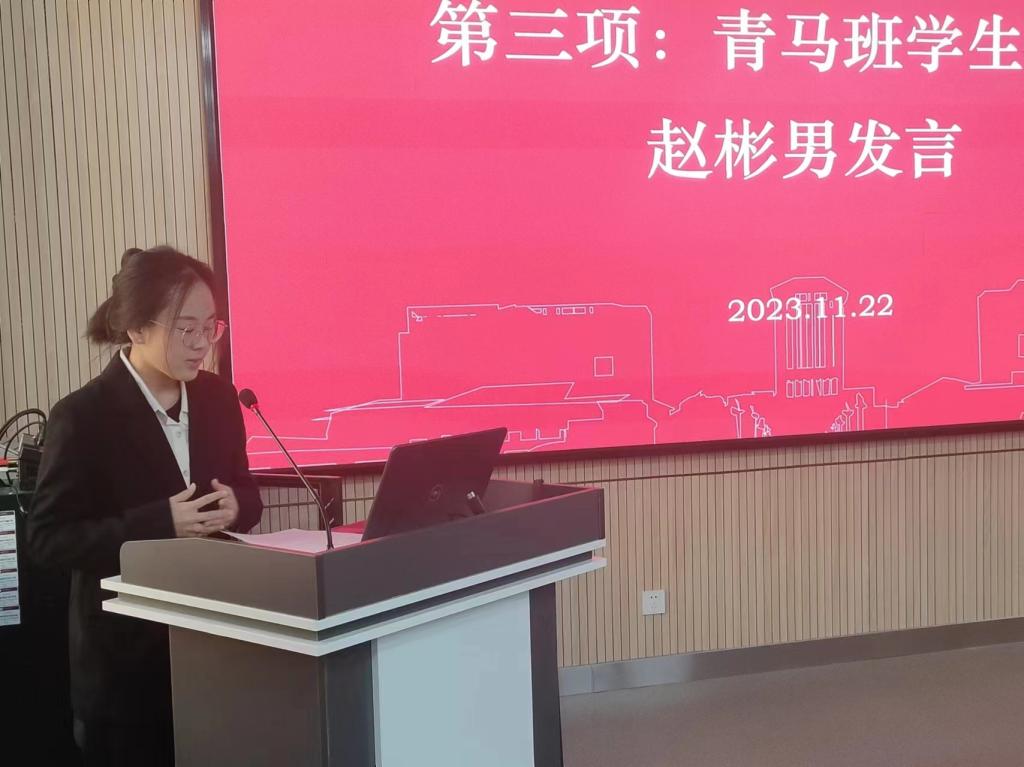 青马班学生代表赵彬男发言,她表示要努力学习和实践马克思主义,将理论学习运用到实际工作和生活中,不断提升和完善自身能力,做好各方面表率,积极服务同学、服务社会,努力成长为政治坚定、德才兼备、素质全面的青年马克思主义者。