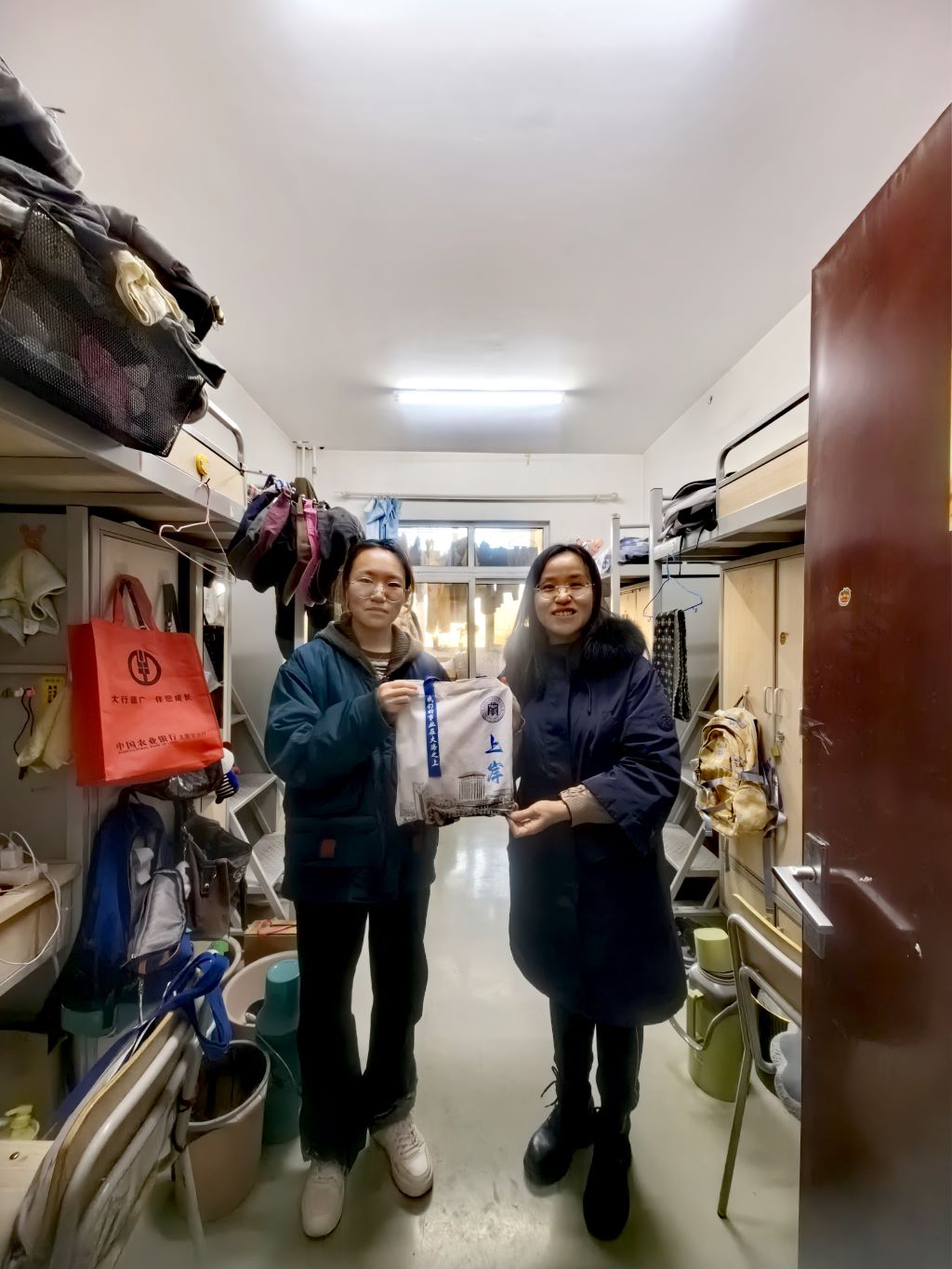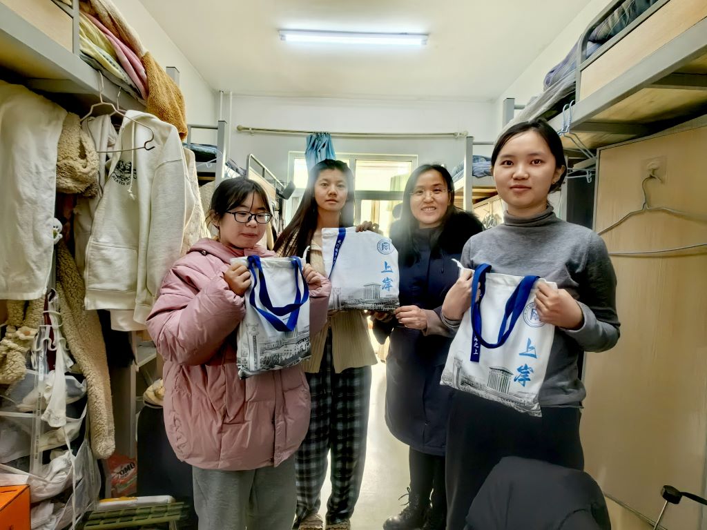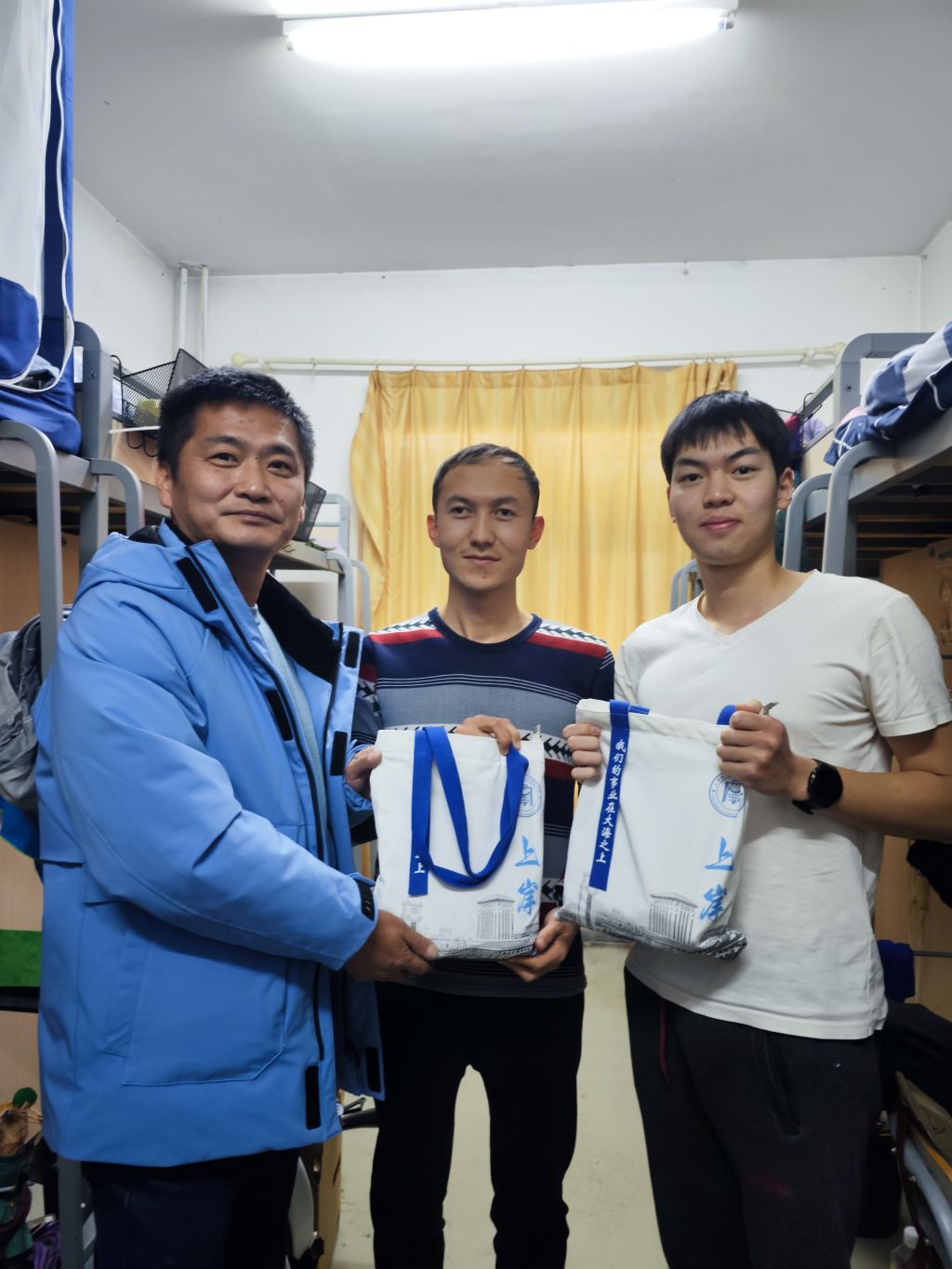 合影留念后,闫新和杨振东到宿舍为考研学生现场发放考研大礼包。
