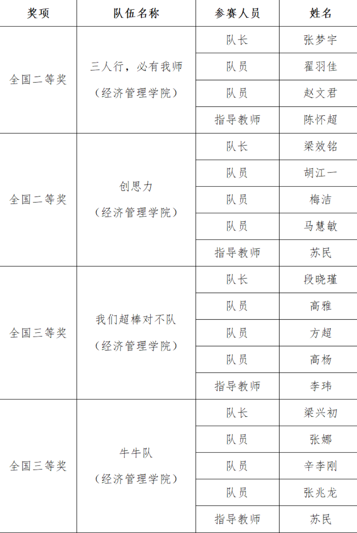 由经济管理学院陈怀超教授指导的MBA研究生张梦宇、翟羽佳、赵文君组成的“三人行,必有我师”队经过激烈角逐,最终斩获全国二等奖。同时,学校另外3支队伍“创思力”“我们超棒对不队”“牛牛队”分别荣获1项全国二等奖、2项全国三等奖。