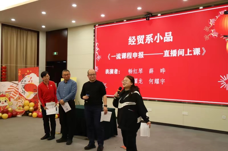 节目精彩纷呈,由经贸系老师带来的节目《一流课程申报——直播间上课》更是将现场氛围推向了高潮。用生动活泼的语言展现出教师们在申报国家一流课程中的坚持与付出。本次茶话会还设置了游戏环节,使现场气氛达到一个新高度。