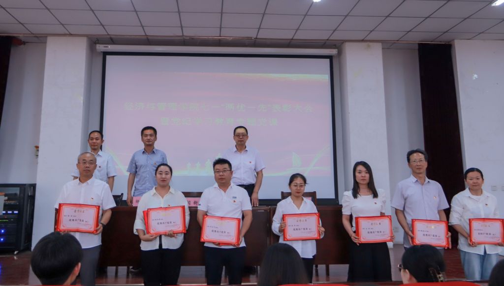 为迎接中国共产党成立103周年,经济管理学院于6月26日下午在学院报告厅隆重举行七一“两优一先”表彰大会暨党纪学习教育专题党课,旨在表彰在党建工作中表现突出的先进个人和集体,激励师生不忘初心、牢记使命,为推动学院高质量发展贡献力量。全体院领导、全体党员、教师代表、学生代表参加。大会由院党委副书记杨振东主持。