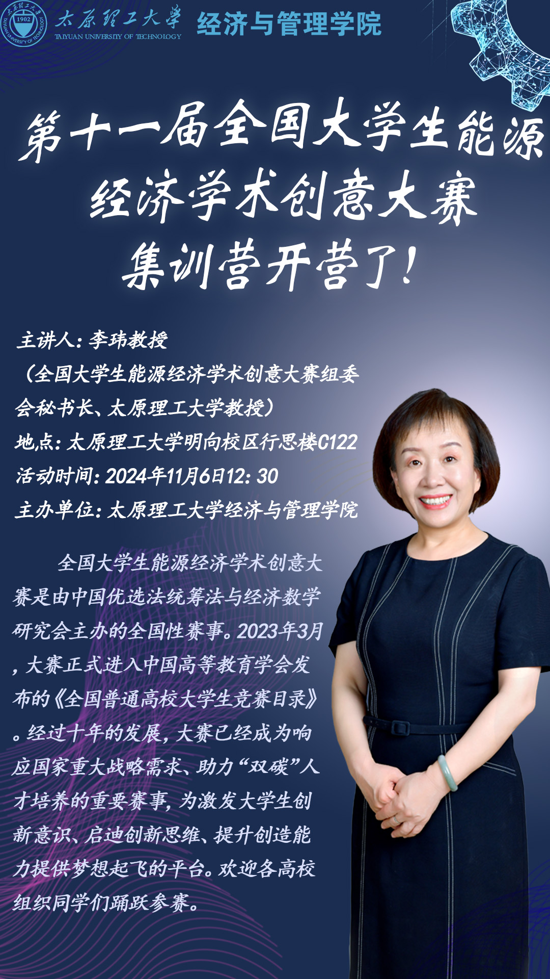 李玮深刻阐述了全国大学生能源经济学术创意大赛在相关领域所占据的重要地位,并就大赛基本情况、官网展示、大赛历史与发展、大赛规范性、大赛特色、注意事项、组织工作核心要点和校赛规定进行了深入的讲解。并就学生的提问进行了现场解答。
