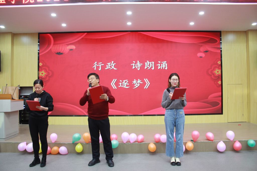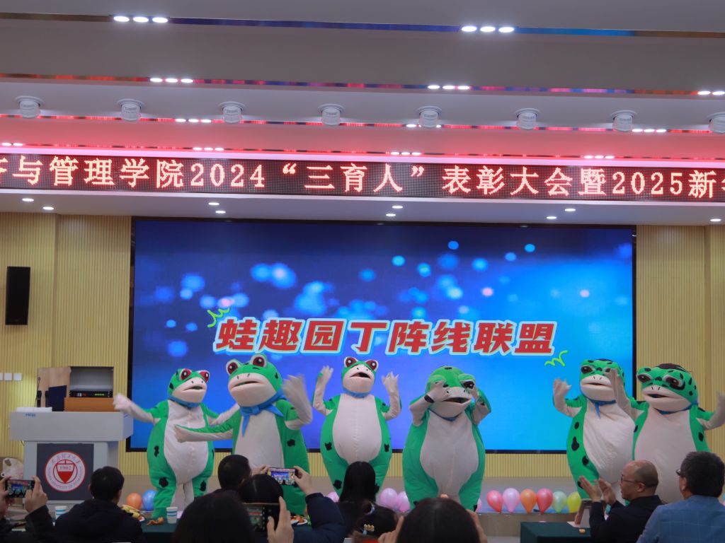 茶话会上节目精彩纷呈,工商系的节目《蛙趣园丁阵线联盟》,老师们化身为一群活泼可爱的“蛙趣园丁”,不仅展现了老师们的多才多艺,更传达出对学生们成长成才的美好祝愿。会计系的节目《凤凰传奇歌曲串烧》,每一个音符都跳跃着生命的活力,每一句歌词都诉说着岁月的沧桑与美好。管科系的诗朗诵《新年,你好》,表达了新年祝福和对美好生活的向往。经贸系的小品《系里那些事》更是将现场氛围推向了高潮,用生动活泼的语言展现出教师们在工作中的坚持与付出。现场笑声连连,掌声不断,为新年茶话会增添了一抹别样的亮色。工会的歌曲《直到世界尽头》。旋律中蕴含着不屈的力量,激励着大家勇往直前,追逐梦想,直到世界尽头,梦想与爱永不熄灭。行政的诗朗诵《逐梦》,梦想如璀璨星辰,引领我们破浪前行。岁月悠悠,不忘初心,我们肩并肩,在逐梦路上砥砺奋进。