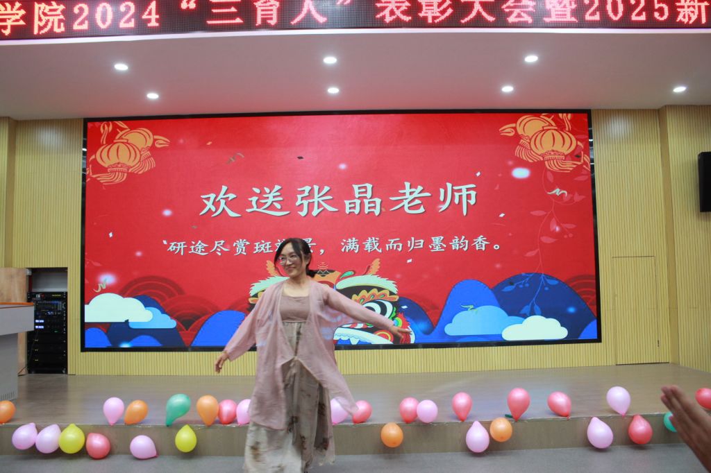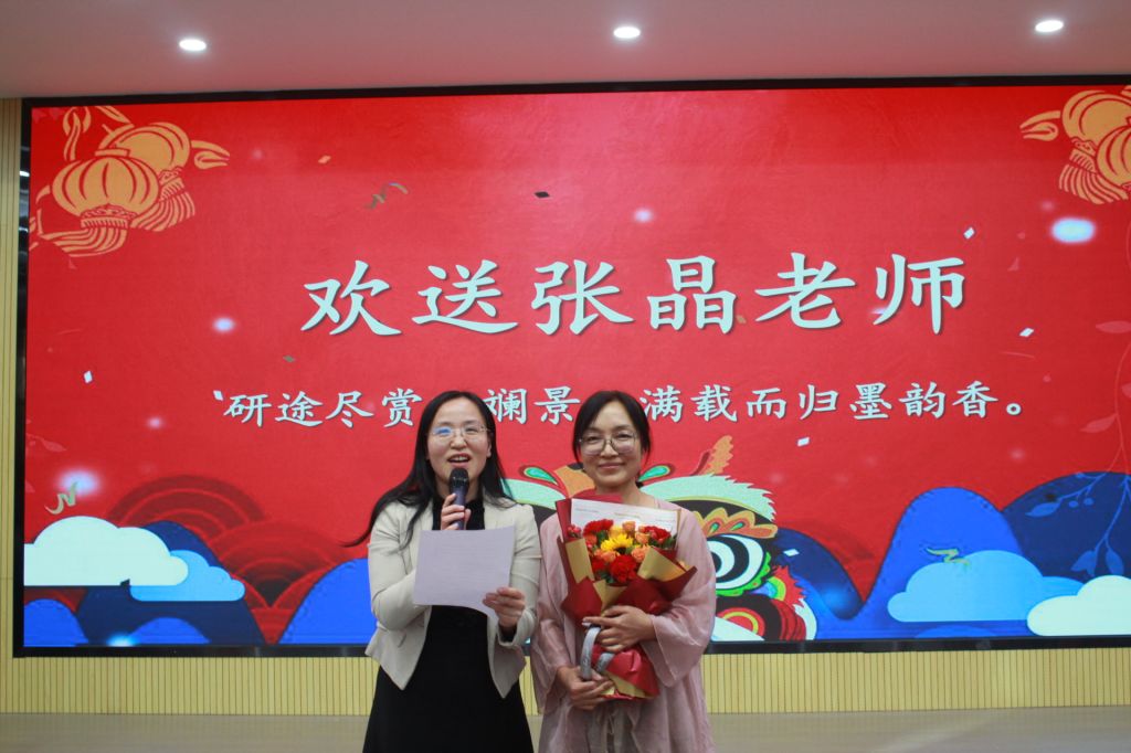 在张晶老师欢送仪式上,闫新为张晶老师颁奖并致以由衷的敬意与感谢,祝愿她今后的学术研究与文化传播事业前程似锦。张晶老师的独舞更是赢得阵阵掌声。