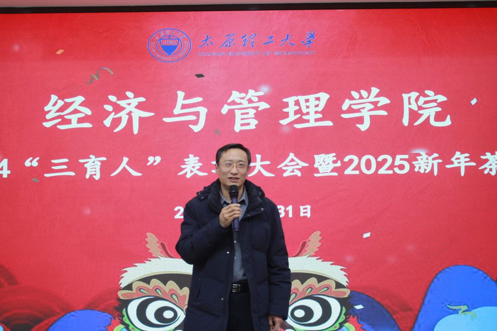 茶话会在学工办的舞蹈《一起喜羊羊》中拉开帷幕。栗继祖发表新年致辞,他代表学院对全体教职工2024年的辛勤付出表示感谢,对2024年取得的成绩表示祝贺。他指出,在校党政的正确领导下、在各职能部门的大力支持下,2024年学院获批数据要素创新与经济决策分析山西省重点实验室,人才引进、教育教学工作也取得重大进步。2025年,学院将继续砥砺前行,走在前、做示范,展现新气象、新成效,共同铸就灿烂的未来!