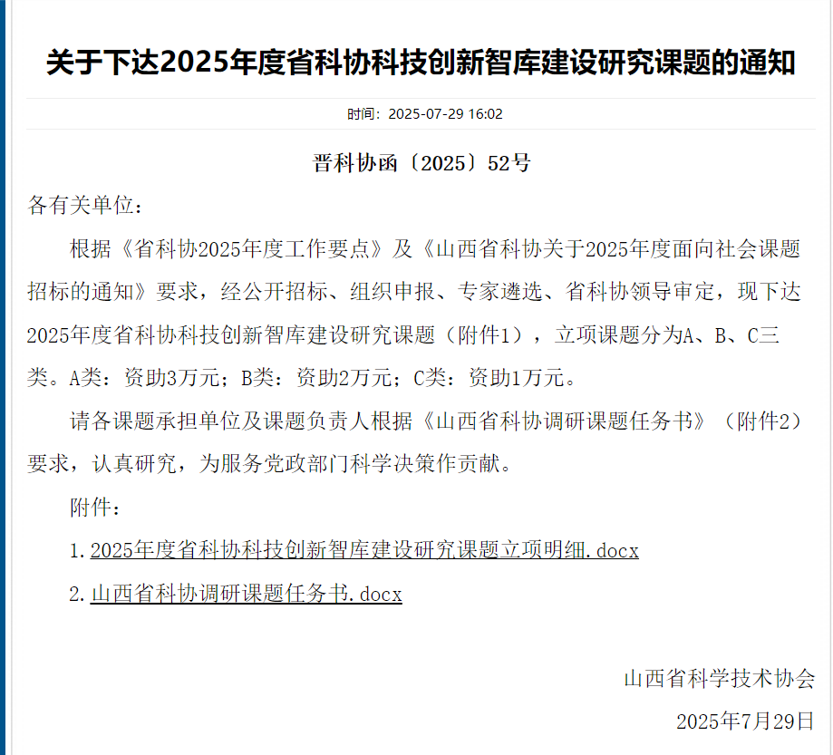 7月29日,山西省科学技术协会发布了“关于下达2025年度省科协科技创新智库建设研究课题的通知”,我院苏民和郭彬两位教授申报项目获A类资助(见下表),占全校立项总数的40%。