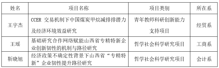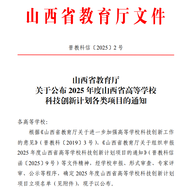近日,山西省教育厅发布了“关于公布 2025 年度山西省高等学校科技创新计划各类项目的通知”,我院王宇杰博士等3位老师申报项目获得立项(见下表)。