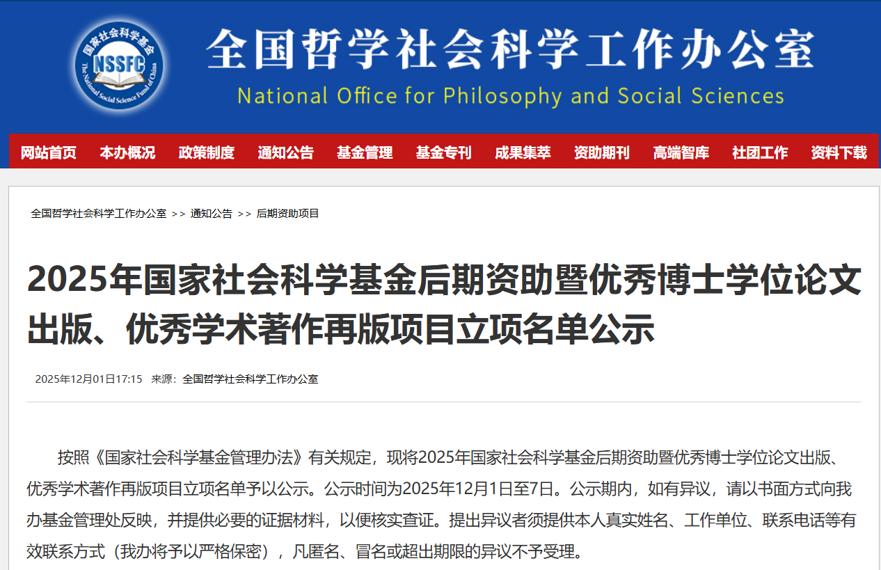 12月1日,全国哲学社会科学工作办公室发布了“2025年国家社会科学基金后期资助暨优秀博士学位论文出版、优秀学术著作再版项目立项名单公示”,我院何学松副教授申报的后期资助项目获批(见下表),占全校立项总数的100%。