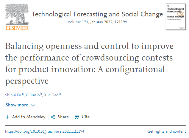 近日,我院教师付轼辉博士的研究成果《Balancing openness and control to improve the performance of crowdsourcing contests for product innovation: A configurational perspective》,发表于创新管理类期刊《Technological Forecasting and Social Change》。该期刊位列JCR分区Q1,2021年影响因子8.593。该论文是付轼辉博士(第一作者)与中国科学院大学孙毅教授(通讯作者)和南开大学高雪博士的合作成果。太阳成城集团经济管理学院为第一署名单位。