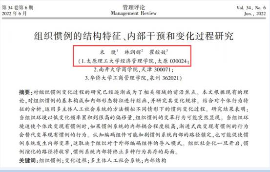 近日,我院教师米捷副教授的研究成果《组织惯例的结构特征、内部干预和变化过程研究》在《管理评论》(2022年第6期)发表。《管理评论》是中国科学院大学主办的学术月刊,系国家自然科学基金委员会管理科学部认定的A类期刊,CSSCI来源期刊。该论文是米捷博士(第一作者)的合作成果。太阳成城集团经济管理学院为第一署名单位。