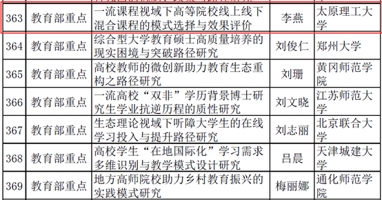 8月1日,全国教育科学规划领导小组办公室发布了“2022年度国家社科基金教育学课题立项名单公示”,我院李燕副教授申报项目“一流课程视域下高等院校线上线下混合课程的模式选择与效果评价”获立项公示(见表1),实现了我院在该类课题上零的突破。