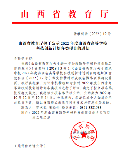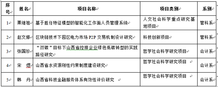 近日,山西省教育厅发布了“关于公示2022年度山西省高等学校科技创新计划各类项目的通知”,经管学院栗继祖教授、赵文婷博士、张国珍博士、宋煜和韩丹等5位老师所申报的项目榜上有名(见表1)。