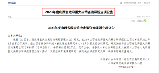 5月24日,山西省社会科学院((省政府发展研究中心))发布了“2023年度山西省政府重大决策咨询课题立项公告”,我院教师张美丽副教授申报项目“动态能力视角下山西省传统制造业数字化转型效应机制与对策研究”获立项资助。