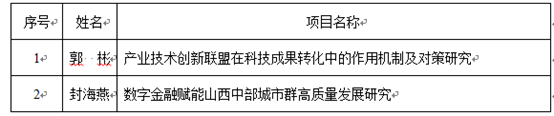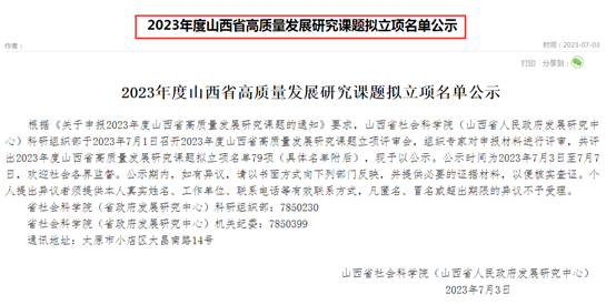 7月3日,山西省社会科学院(山西省人民政府发展研究中心)发布了“2023年度山西省高质量发展研究课题拟立项名单公示”,我院郭彬教授和封海燕博士获拟立项资助(见表1)。