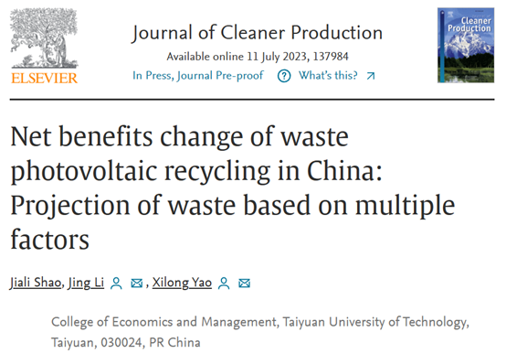 近日,我院硕士生邵加利和其导师姚西龙教授及我院教师李静老师共同完成的论文《Net benefits change of waste photovoltaic recycling in China: Projection of waste based on multiple factors》,在环境经济类与管理类国际TOP期刊《Journal of Cleaner Production》发表,该期刊位列JCR分区Q1,最新影响因子11.1。我院硕士生邵加利为第一作者,姚西龙教授和李静老师为通讯作者,太阳成城集团经济管理学院为第一署名单位。