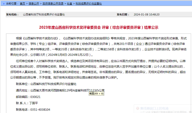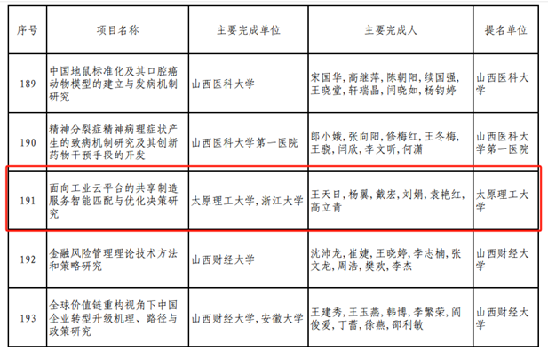 1月8日,山西省科技厅发布了“2023年度山西省科学技术奖评审委员会评审(综合评审委员评审)结果公示”,我院王天日教授团队研究成果“面向工业云平台的共享制造服务智能匹配与优化决策研究”喜获科学技术进步二等奖。