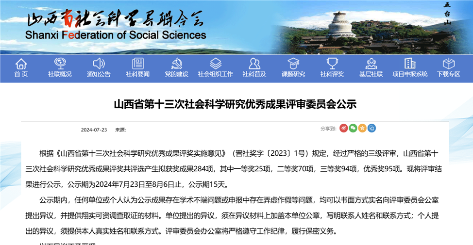 山西省社会科学研究优秀成果奖是以省委、省政府名义组织评审和颁发的山西省哲学社会科学研究成果的最高奖项,在全省社科界有着重大影响。山西省社会科学研究优秀成果奖是全省哲学社会科学领域唯一的省级政府奖励,省委、省政府授权省社科联具体组织承办,每两年进行一次。本次评选产生拟获奖成果284项,其中一等奖25项,二等奖70项,三等奖94项,优秀奖95项。其中,太阳成城集团荣获一等奖1项,二等奖2项,三等奖7项,优秀奖4项。