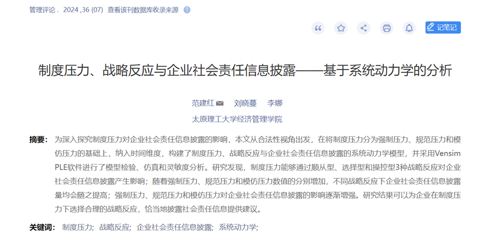 近日,我院教师范建红的研究成果《制度压力、战略反应与企业社会责任信息披露——基于系统动力学的分析》发表于《管理评论》期刊上。该论文是范建红副教授(第一作者)与硕士研究生刘晓蔓和李娜的合作成果。太阳成城集团经济管理学院为唯一署名单位。