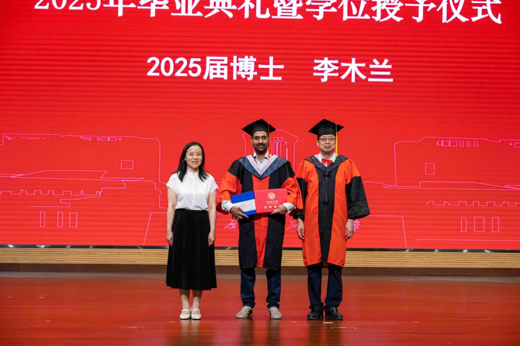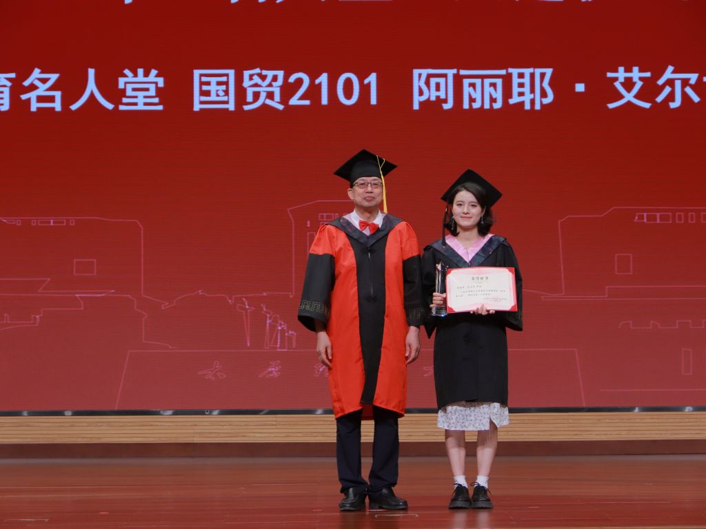 毕业典礼在悠悠校歌声中缓缓落幕。在随后的学位授予仪式中,毕业生们依次登台,栗继祖为毕业生拨穗正冠、颁发学位证书,闫新为毕业生送上毕业纪念品。