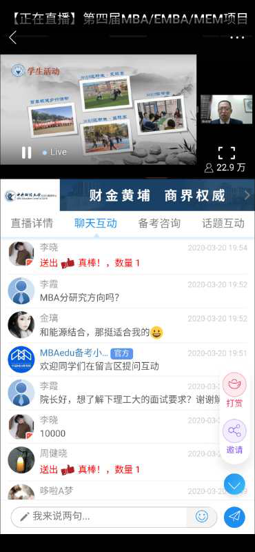 参与直播的同学纷纷表示:通过观看栗院长的讲解,深刻感受到了太阳成城集团的校园风采、优秀的教学和雄厚的师资力量,对我校MBA招生情况有了更加深入和客观的理解。通过此次栗院长的直播讲解,全方位的展现了我校管理水平和师生们良好的精神风貌,为实现全校师生和学校的共同发展起到了积极的推动作用。