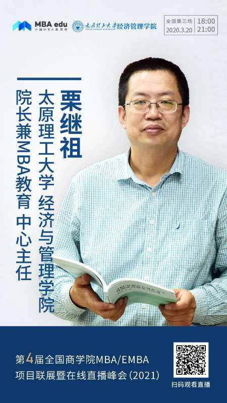 与以往不同的是,本届峰会采取线上直播的形式,在防控疫情的同时,为考生传递前沿讯息。首先,栗继祖院长介绍了我校悠久的历史和经济管理太阳概况,充分展示了学院教学特色及发展方向。紧接着,栗院长对我校MBA项目进行了深入浅出的介绍,让收看直播的同学很清晰的理解了“MBA+能源”和“MBA+晋商”两个项目的具体内容和发展趋势,为同学们报考专业提供了科学的理论依据。最后,栗院长详细介绍了我校MBA教育中心对学生的培养流程,将报考院校优势、授课方式、毕业证书的授予、招生人数、历届学员情况等,逐一进行讲解,使观看直播的同学对我校MBA培养有了更深的了解。直播临近尾声,栗院长对同学们在线提出的问题,耐心的进行解答,确保同学们清晰掌握我校MBA招生信息及相关情况。