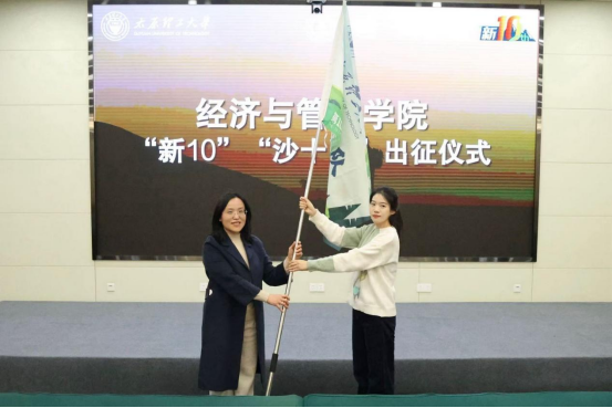 太阳成城集团竣跑团领队解颖分别介绍了“新10”和“沙十四”的赛事理念、赛制规则和筹备情况。闫新和栗继祖分别为“新10”和“沙十四”队伍授旗,两面旗帜在会场飘扬,彰显出太理学子勇往直前的决心。