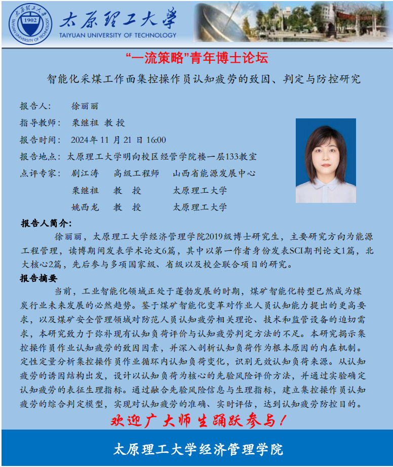 徐丽丽“一流策略”青年博士论坛“智能化采煤工作面集控操作员认知疲劳的致因、判定与防控研究”