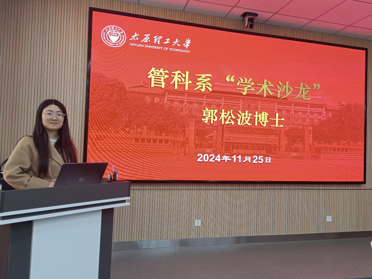 为促进学术交流、激发创新思维,管科系举行“党建引领 智启未来——学术沙龙系列活动”。11月25日,郭松波博士在学院229会议室,作了题为“混合平台运营模式选择与资源共享策略研究”的首场学术分享,学院副院长王天日教授和管科系近20名教师参加了本次活动,活动由管科系副主任何学松副教授主持。