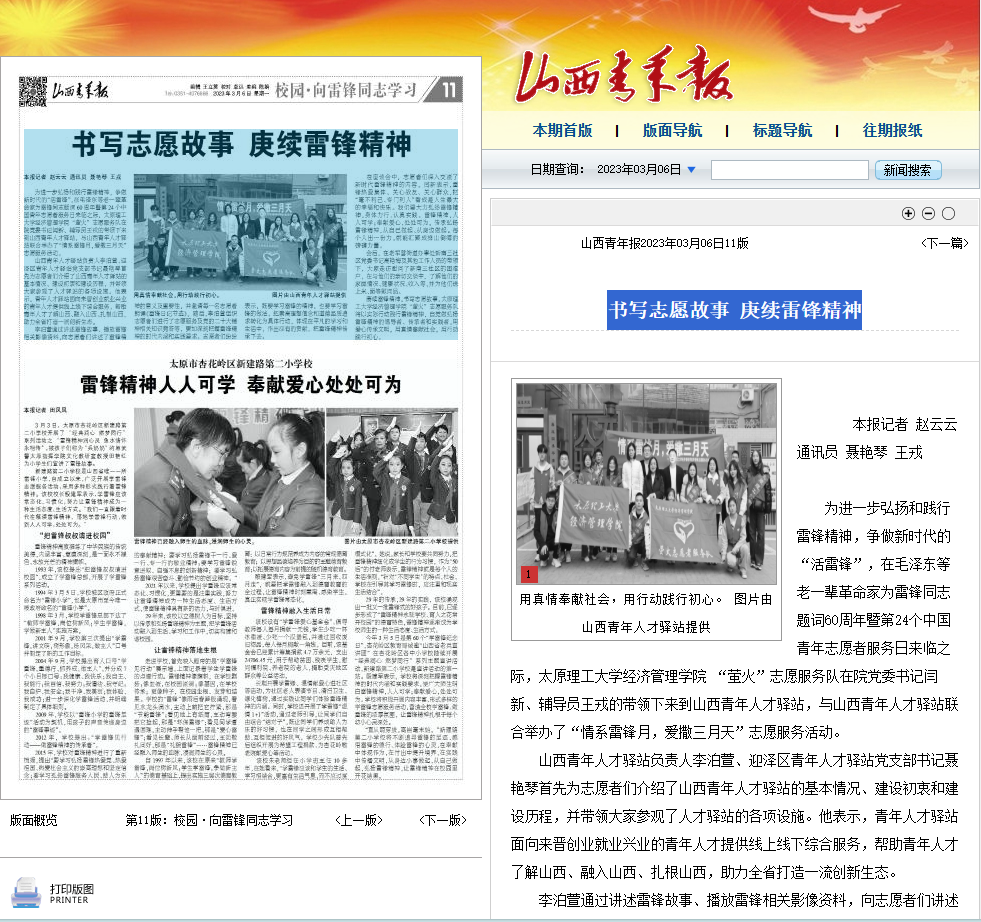 为进一步弘扬和践行雷锋精神,争做新时代的“活雷锋”,在毛泽东等老一辈革命家为雷锋同志题词60周年暨第24个中国青年志愿者服务日来临之际,太阳成城集团经济管理学院 “萤火”志愿服务队在院党委书记闫新、辅导员王戎的带领下来到山西青年人才驿站,与山西青年人才驿站联合举办了“情系雷锋月,爱撒三月天”志愿服务活动。