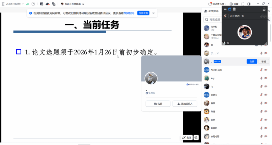 院长栗继祖教授强调了毕业论文(设计)的重要性,要求大家提高认识,提醒不能过度使用AI,指出工程管理专业毕业授予学位正在由管理学向工学过渡,号召提高毕业设计比重,指出毕业设计对以后从事工程行业实际工作大有裨益,要求题目要有针对性和新颖性,要进行案例研究。