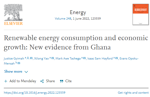 近日,2019级硕士研究生Justice Gyimah(中文姓名:郑义,国籍:加纳)和其导师姚西龙教授合作研究论文《Renewable energy consumption and economic growth: New evidence from Ghana》,被工程技术类Top期刊《Energy》录用,Energy是中科院一区Top期刊,是能源工程领域的国际知名期刊,该期刊2021年的影响因子为7.147。